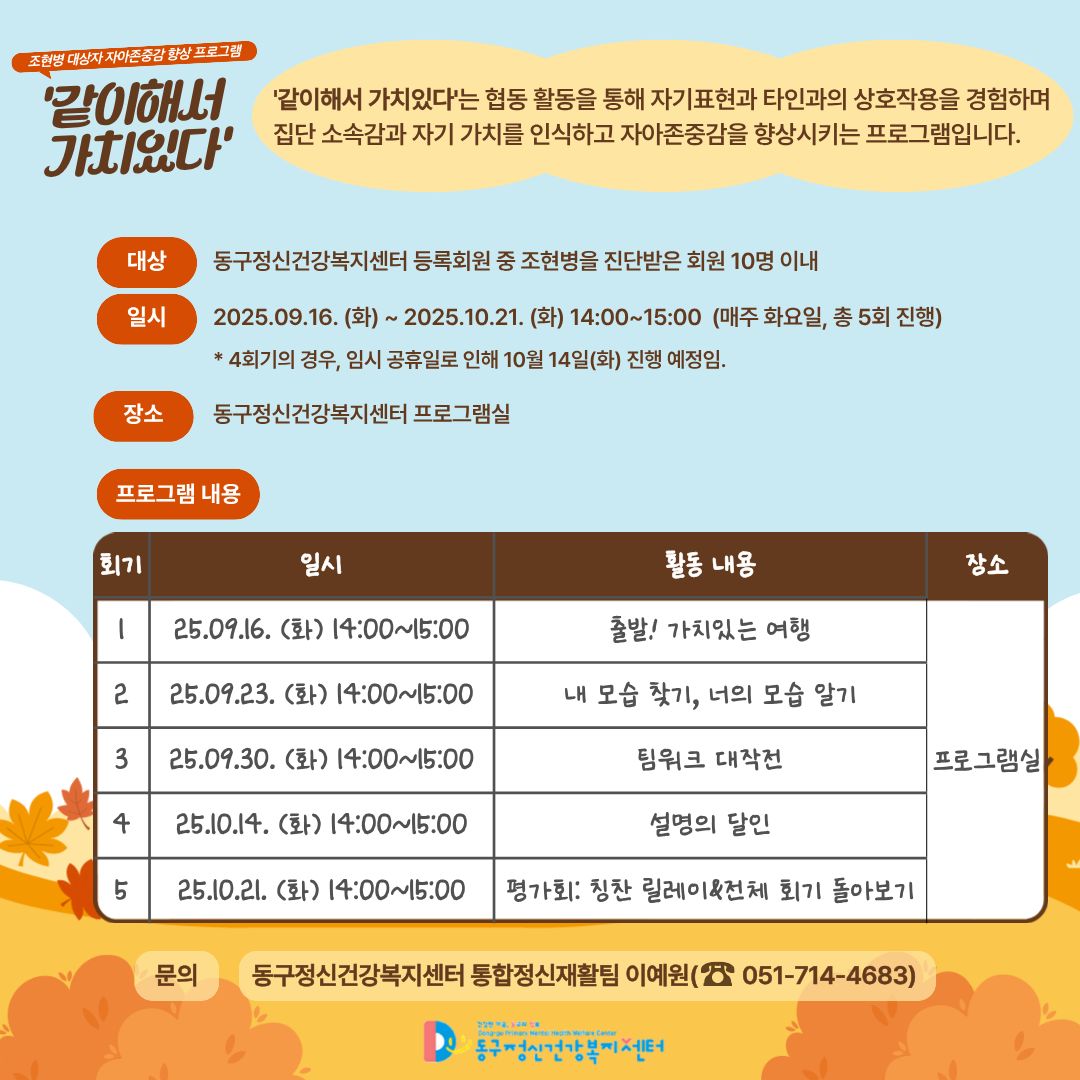 문의사항이 있으시다면 동구정신건강복지센터(☎051-911-4600) 또는 프로그램 담당자(☎051-714-4683)에게 문의 바랍니다.