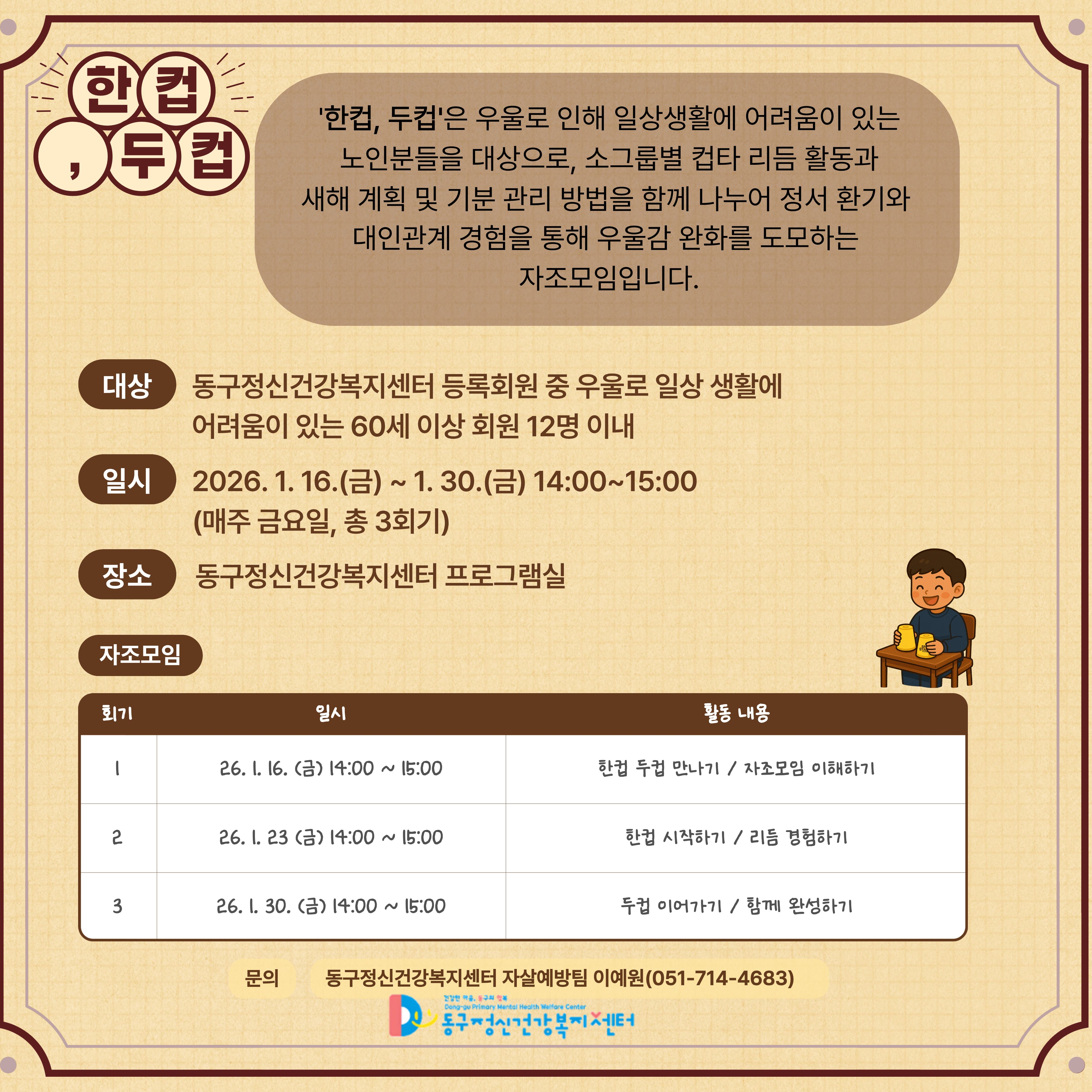 2026년의 시작을 알리는 노인 우울 대상 자조모임 "한컵, 두컵"이 시작됩니다.