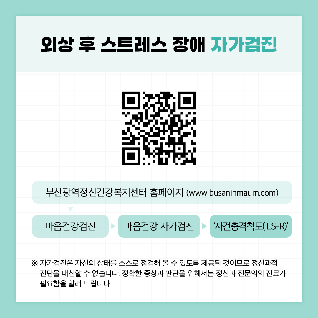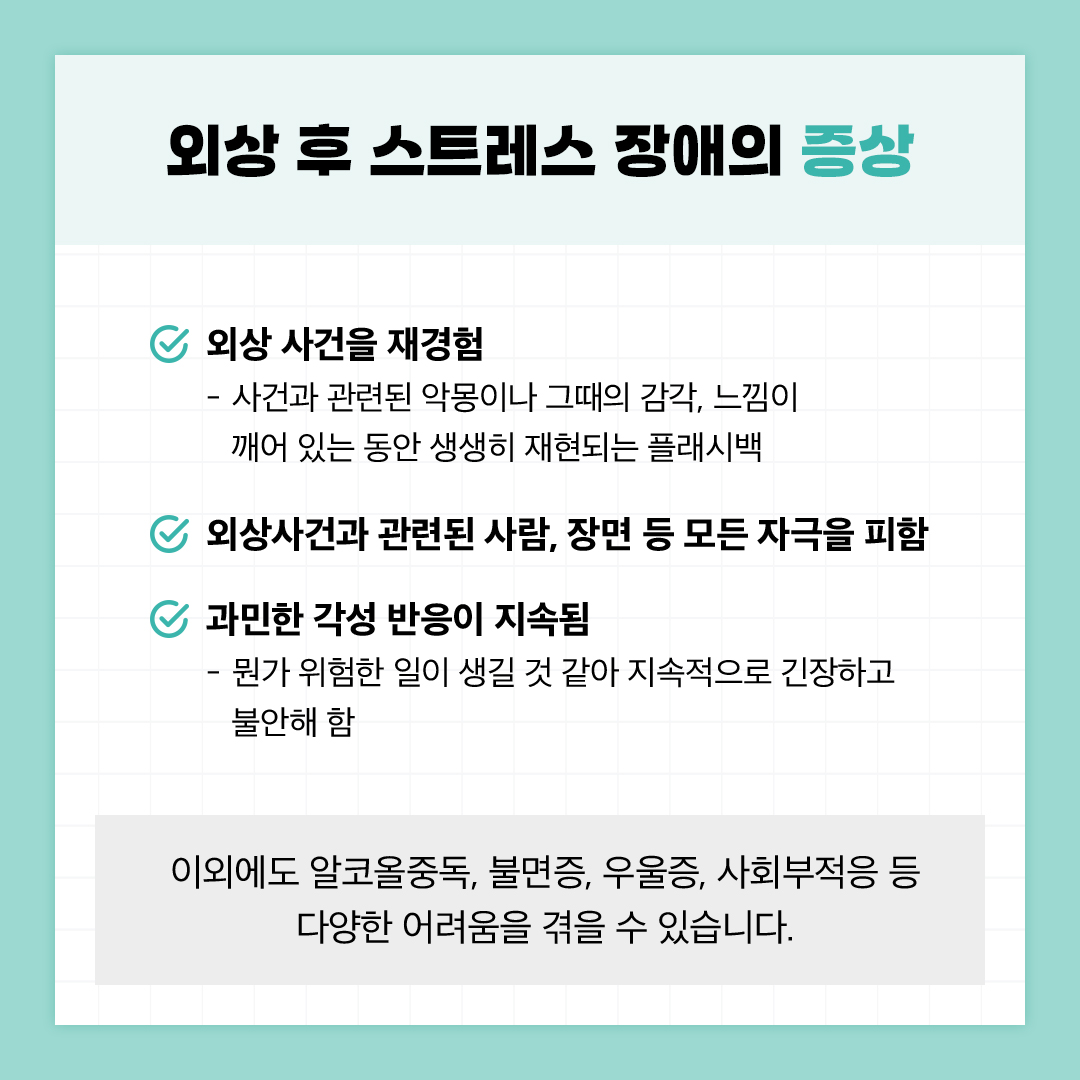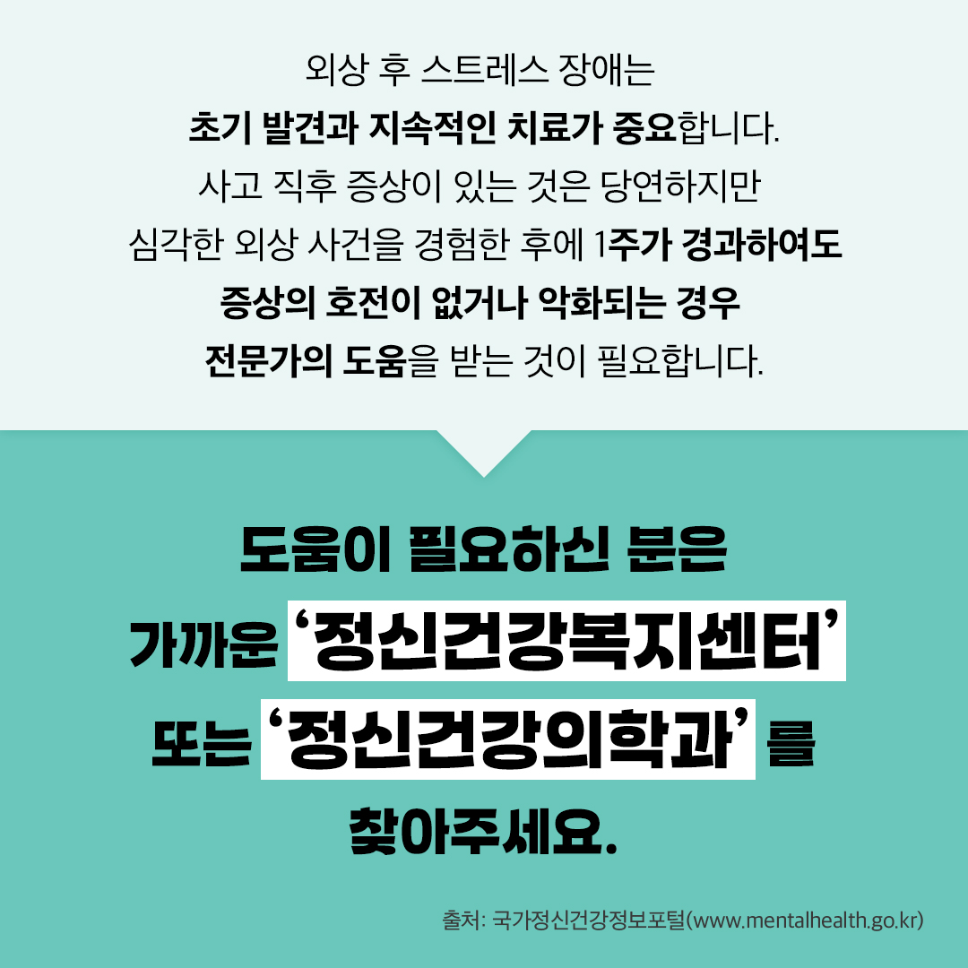 사고 직후 증상이 있는 것은 당연하지만 심각한 외상 사건을 경험한 후에 1주가 경과하여도 증상의 호전이 없거나 악화되는 경우 전문가의 도움을 받는 것이 필요합니다.