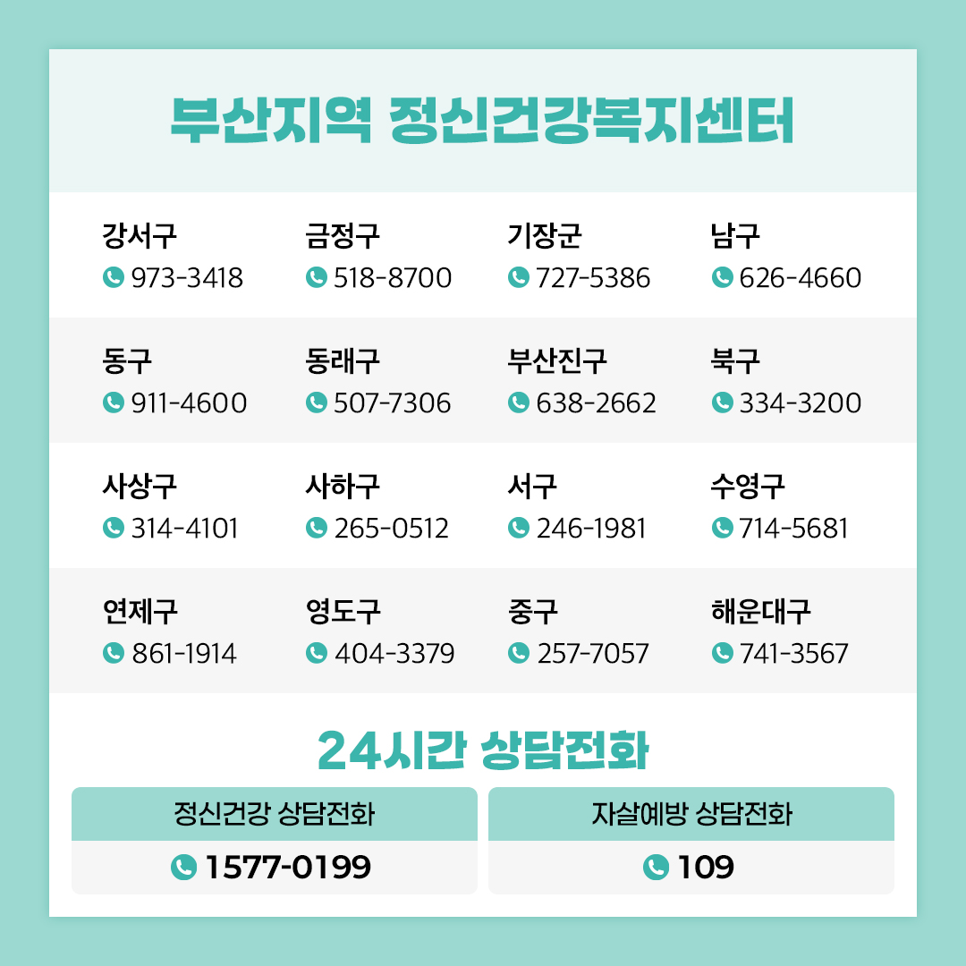 동구정신건강복지센터(평일 오전 9시~오후6시) 대표번호 051-911-4600